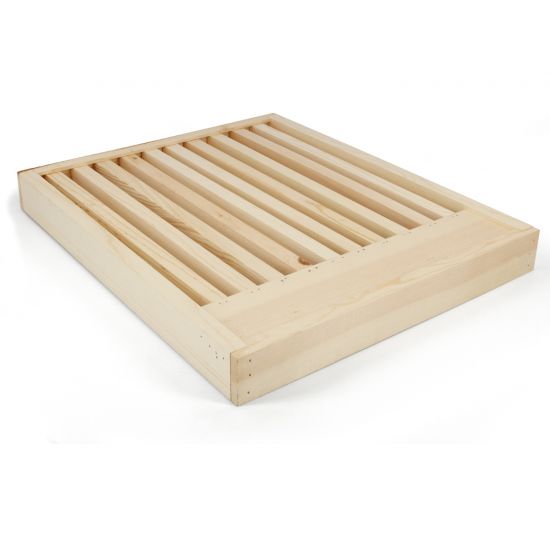 A 10-frame slatted rack is not considered an essential component of a standard hive, however, we do favor these and think that they will help with your hive tremendously especially if your hives are located in northern regions where the weather tends to go from extreme cold to extreme warm throughout the seasons. The basic functions of a slatted rack are to add additional cluster space for less congestion at the bottom of the hive and also to help with extra ventilation. Generally, bees will gnaw on the bottom portion of the wax comb of the frames nearest to the bottom board which makes it impossible for the queen to lay eggs there. They do this to protect the health of the cluster from extreme temperature variations. In the winter, a slatted rack keeps the brood chamber warmer so that the queen can lay eggs all the way to the bottom of the lowest frames. In spring and summer when the colony populations are the largest, a slatted rack provides extra cluster space again by allowing the queen to lay eggs lower which in turn can reduce swarming. They are placed in between the bottom board and the bottom brood box and can be left on the hive all year long. The slats run perpendicular to the entrance of the hive. Our slatted racks are made of strong, sturdy pine and come fully assembled. We recommend painting the exterior for added protection from the weather. They measure 20 long by 16.25 wide and can only be used on 10-frame hives.Specifications