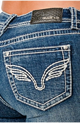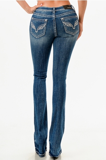 34 INCH INSEAM; BOOTCUT; MID RISE; STITCHED WING POCKET DESIGN