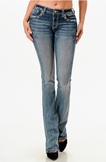 The Grace in LA women’s Easy Fit boot cut jeans show off your best shape by featuring a higher rise. The mid-rise creates a form-flattering fit for every curve. This medium blue style features a stitched wing pocket design.Specifications