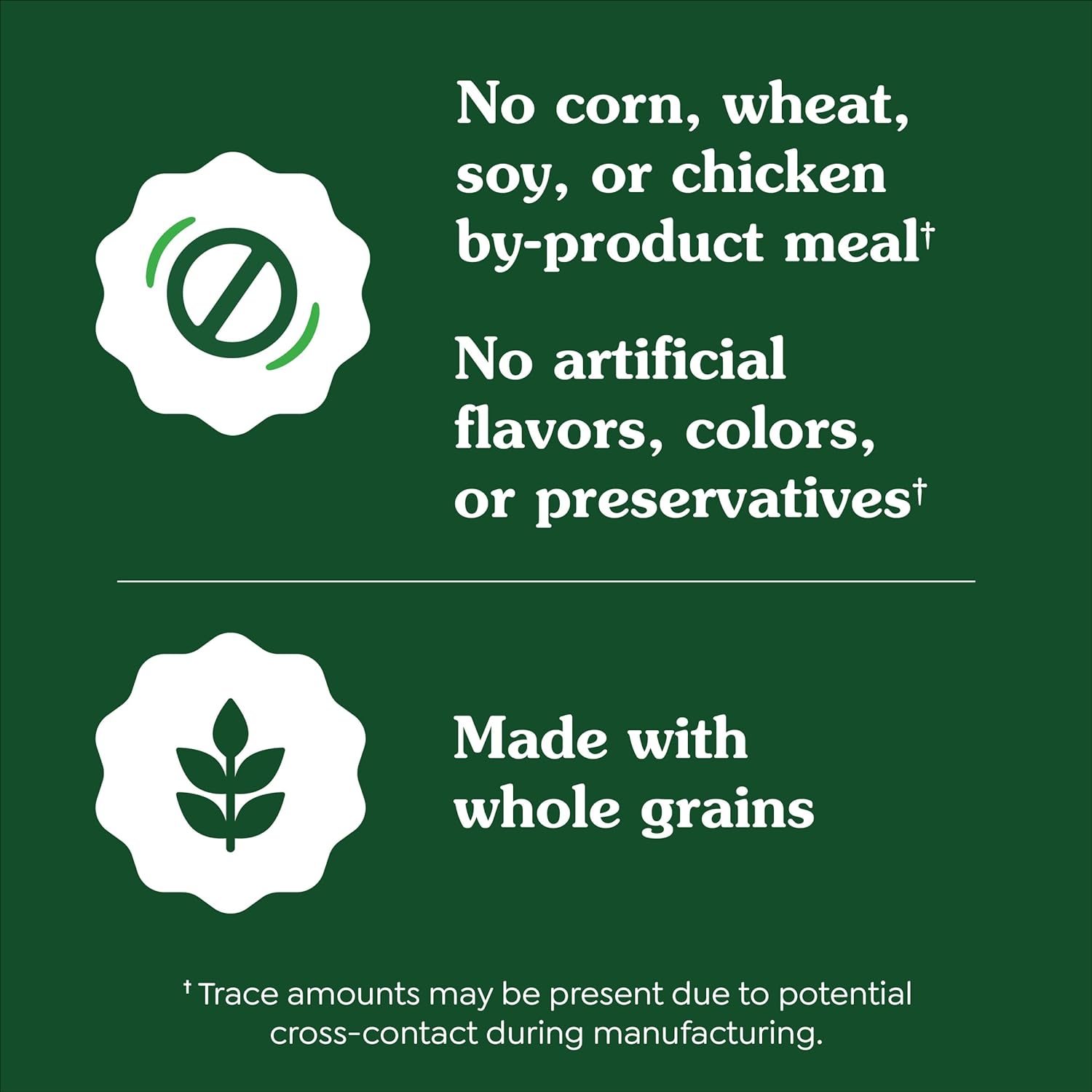 CONTAINS VITAMIN E, AN ANTIOXIDANT TO SUPPORT A HEALTHY IMMUNE SYSTEM; FORMULATED WITHOUT CORN, WHEAT, SOY OR CHICKEN BY PRODUCTS; MADE WITH REAL, RECOGNIZABLE INGREDIENTS; NO ARTIFICIAL COLORS, FLAVORS OR PRESERVATIVES