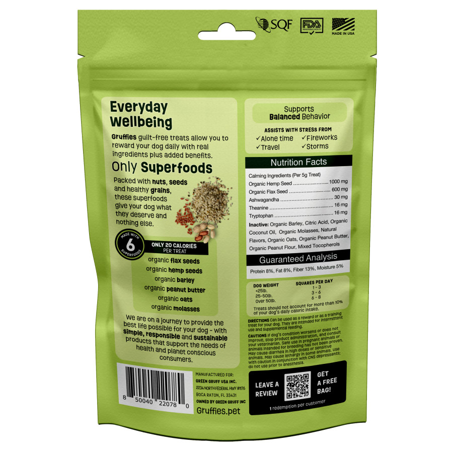 Gruffies Calming is a specially formulated dog treat designed to help soothe and relax your furry friend during times of stress or anxiety. Infused with the natural power of ashwagandha, a renowned adaptogen, our treats support your dog's ability to cope with stress and promote a sense of calm. Theanine, an amino acid found in green tea, works in synergy with ashwagandha to enhance relaxation and improve mood. Tryptophan, an essential amino acid, helps increase serotonin levels in your dog, further promoting a sense of well-being and calmness. Choose Gruffies Calming for a natural, effective way to help your pet relax and enjoy a more peaceful state of mind.Specifications