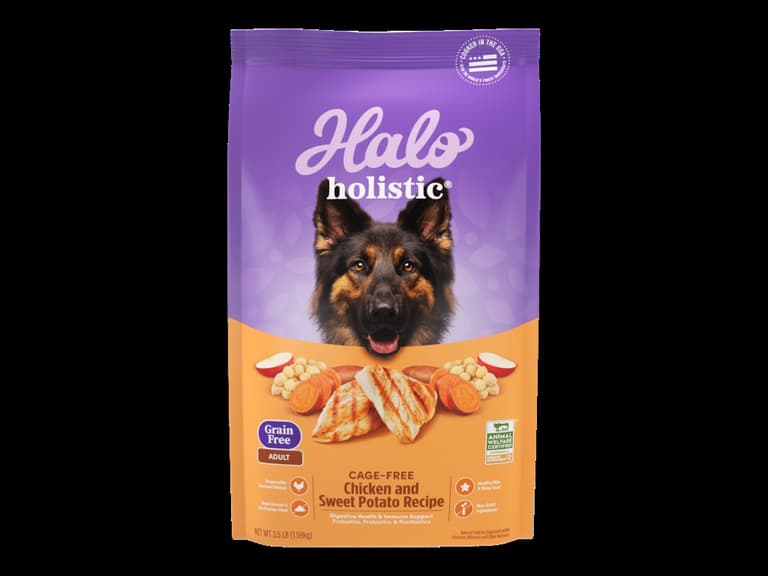 Boost your dog’s digestive health with Halo Holistic Cage-free Chicken and Sweet Potato Recipe, a grain free dry dog food formulated with high-quality ingredients for digestive health. Your pet’s health starts in their gut, and our holistic dog food is made with high-quality ingredients that optimize their overall well-being. We start with real, cage-free, certified chicken as the first ingredient. Our super premium dog food uses only real, whole meat, poultry or fish, and no meat meal at all, for a rich flavor that your pet will love. Plus, as a digestive dog food, it includes prebiotics and probiotics for dogs, plus postbiotics to support every stage of digestion. Our natural dog food dry formula is cooked in the USA and has added vitamins, minerals, and nutrients. Each recipe supports healthy skin and coat for dogs with no corn, wheat or soy or artificial preservatives. No gimmicks, no phony claims. Just incredible pet food. That’s Halo Holistic chicken and sweet potato dog food.Specifications