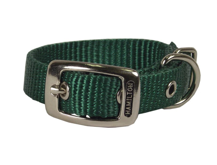 Hamilton Nylon Dog Collars come in a vibrant rainbow of basic solid and fashion colors that are made from only the finest first run, premium grade nylon. Which ensures durability and safety. High thread count webbing creates unmatched quality dog accessories. Cuts that are finished away from the pet's coat and out performs competitor products in comfort,flexibility, and endurance. Collars are fully adjustable to perfectly fit all breeds and the unique O ring placement enhance the collar's strength.Specifications
