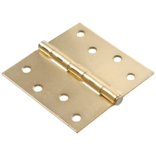 Hardware Essentials square corner satin brass door hinges are a sturdy reliable way to mount your doors with ease. Though they remain mostly unseen a quality set of hinges can be the difference between a noisy sagging daily frustration and a silent pristine entryway. Hinges are full mortise with beveled holes for a flush mount.Specifications