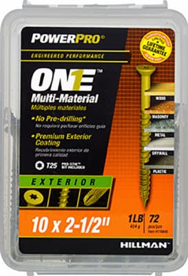 Engineered for optimum performance in multiple materials, Power Pro ONE screws are the one screw you'll ever need. Developed to outperform and replace standard wood, sheet metal, and concrete/masonry screws, the ONE Screw program simplifies your tool box by using a single, innovative, engineered screw design to satisfy projects that fasten into wood, metal, concrete, drywall, and plastic.Specifications