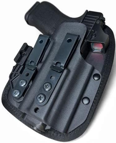 Fitted for all slide mounted optics; inside the waistband (IWB) fit with foam & mesh backer; Simply adjust the included retention plate based on Sidearm thickness to dial in the perfect retention for any Sidearm; Use with fullsize, compact and sub-compact pistols; with two pre-installed 1.75" steel clips and concealment wing