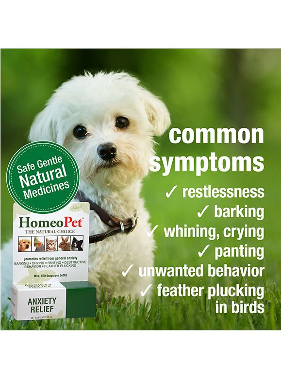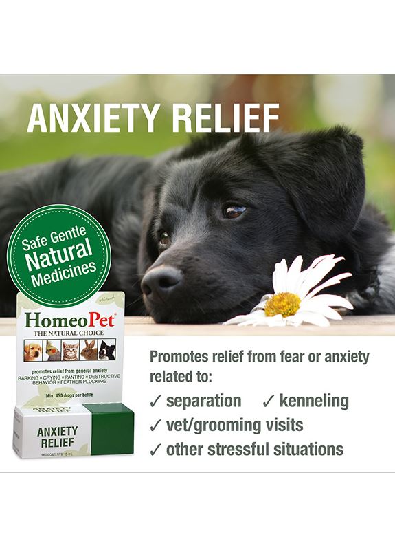 Anxiety support for pets HomeoPet Anxiety Relief medicine may help promote relief from fear and anxiety in dogs, cats and other animals related to separation, kenneling, vet or grooming visits, and other stressful situations. A safe and natural aid for anxious pets, this homeopathic medicine may help provide relief from the symptoms of anxiety such as restlessness, barking, whining, crying, panting, unwanted behavior or feather plucking in birds.Specifications
