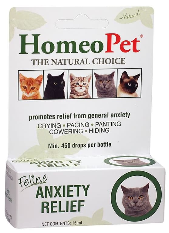 Stress and anxiety support for cats HomeoPet Feline Anxiety Relief medicine may help promote relief from fear and anxiety in cats related to vet and grooming visits, a new pet or new baby in the household, and separation from familiar surroundings caused by a house move or cattery and boarding stays. This safe and gentle stress calming aid may help provide relief from the symptoms of anxiety such as meowing, crying, pacing, panting, cowering, or other unwanted behavior.Benefits: Safe Ingredients. Our safe, gentle cat anxiety medication is made from natural ingredients that may help treat anxiety in your kitten, adult, or senior cat. Fast acting liquid that is simple and easy to use. You can put the Feline Anxiety Relief drops directly into your cat’s mouth, or if direct dosing is a challenge simply put the drops in water, or dose at meal or snack time as per pack instructions. Veterinary Formulated. Daniel H. Farrington and his veterinarian brother Thomas Farrington created HomeoPet to bring high-quality, safe, natural, and affordable treatments and supplements to pets and pet parents worldwide. Simple, Safe & Pure with no known side effects and has been safely used long term. Competition legal HomeoPet products are registered medicines, not performance enhancing products. Nothing in any of HomeoPet’s medicines test positive in show animals, therefore they are considered extremely safe for competition use. Great Value with up to 90 doses per bottle (depending on weight). HomeoPet Feline Anxiety Relief cat medicine is specifically formulated for the unique physiology of felines and can be used on cats and kittens of all ages.May help promote relief from the following symptoms: Meowing Crying Pacing Panting Cowering Unwanted behaviorSpecifications