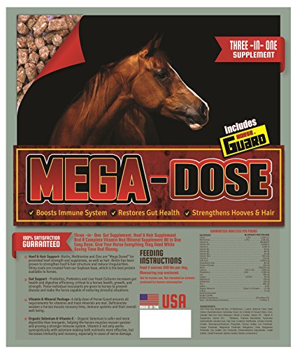 10 POUNDS; AIDS IN FASTER MUSCLE RECOVERY; HELPS TO IMPROVE DIGESTION; MEGA DOSE GIVES YOU THE ASSURANCE THAT YOU ARE FEEDING THE HIGHEST QUALITY OF INGREDIENTS INCLUDING CHELATED MINERALS PHARMACEUTICAL-GRADE VITAMINS AND FOOD-GRADE CARRIERS; PROMOTES IMPROVED OVERALL HEALTH; PROMOTES SHINY COATS AND HEALTHY HOOVES