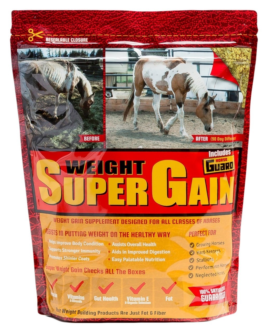 Horse Guard Super Weight Gain is actually three supplements in one easy dose that will make a huge difference in your horse. First, it features full-energy, full-fat soybeans that we extrude onsite for weight gain and coat condition. Then, we add both a complete pro & prebiotic supplement to get the digestion going again. Finally, we add the vitamin-mineral package of Horse Guard for overall health.Specifications