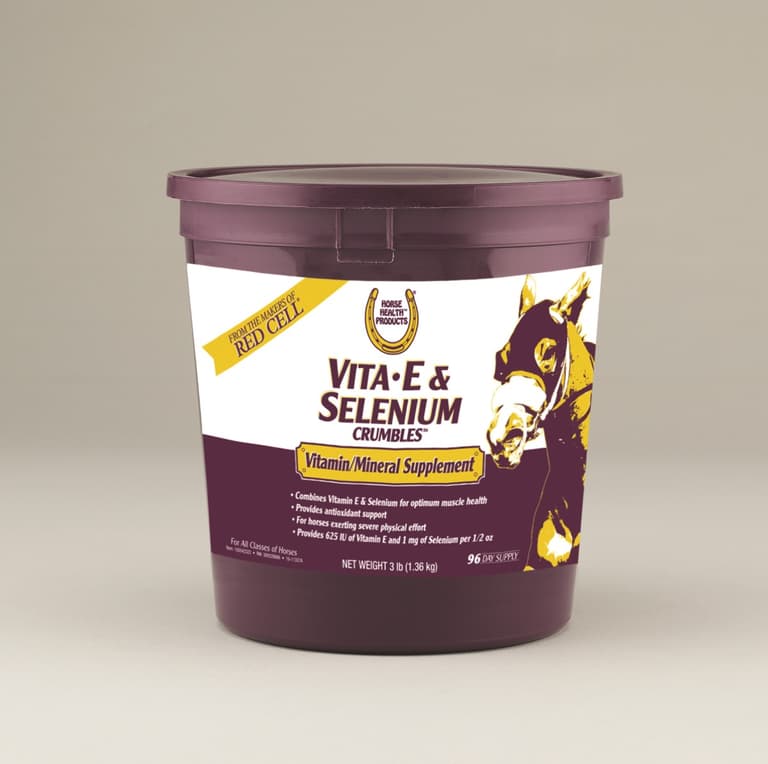 3 POUNDS; APPROPRIATE FOR HORSES EXERTING SEVERE PHYSICAL EFFORT; FOR ALL CLASSES OF HORSES; IN EASY-TO-FEED CRUMBLES; PROVIDES 625 IU OF VITAMIN E AND 1 MG OF SELENIUM PER 1/2 OUNCE; PROVIDES ANTIOXIDANT SUPPORT