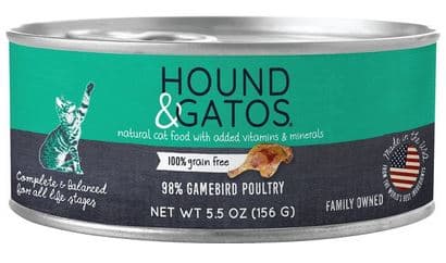 Help your favorite feline eat the way nature intended with the flavorful nutrition of Hound & Gatos 98% Gamebird Poultry Formula Grain-Free Cat Food. Made in the USA with only the best quality ingredients available, this tasty wet food packs a powerfully healthy punch with the essential vitamins and minerals that your kitty needs, while leaving out the fillers and artificial additives that he doesn’t. Free from grain, gluten and soy, this deliciously meaty diet is high in protein and ultra-hydrating, helping to keep cats satisfied. And even finicky felines love the moist, juicy texture and mouth-watering flavor of real turkey, duck, Guinea fowl and quail in this wholesome pate style canned food!Specifications