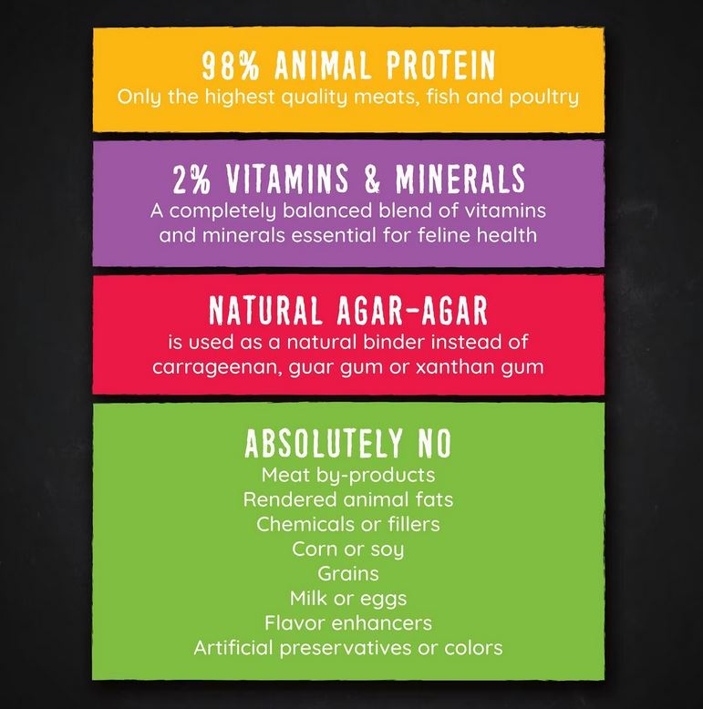 100% FREE FROM ARTIFICIAL PRESERVATIVES; AN ANCESTRALLY APPROPRIATE CARNIVORE DIET MADE WITHOUT PLANT PROTEIN; CONTAINS 98% ANIMAL PROTEIN; FORTIFIED WITH VITAMINS & MINERALS; MADE WITHOUT ADDED CARBOHYDRATES; SOURCED AND MADE IN THE USA