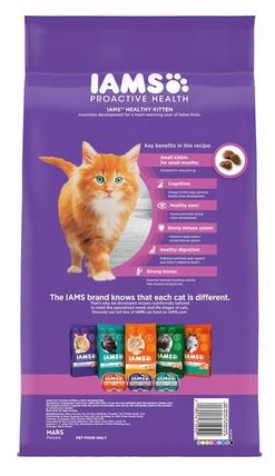 Help your kitten grow into a strong, healthy adult cat with IAMS PROACTIVE HEALTH Healthy Kitten Dry Cat Food with Chicken, designed for a cat’s first year of playful, fluffy, furry, feline firsts. Chicken is the #1 ingredient in this high protein kitten kibble, designed in bite sized pieces perfect for little mouths. With nutrients like those in their mother’s milk plus vitamin E, this dry kitten food helps build strong immune defenses in young cats. This recipe is also made with omega-3 DHA for brain development, as well as prebiotics and beet pulp to support your kitten’s digestive health. If you’re looking for kitten food to support healthy development for your kitten’s first year, get your paws on this and keep your kittens happy, healthy, and ready to pounce as they grow into adult cats with IAMS.Specifications