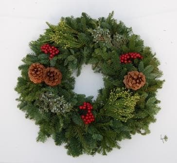 This 12 Wreath is hand-made using Fresh Live Noble and decorated with Juniper, Berries & White Cones.Specifications