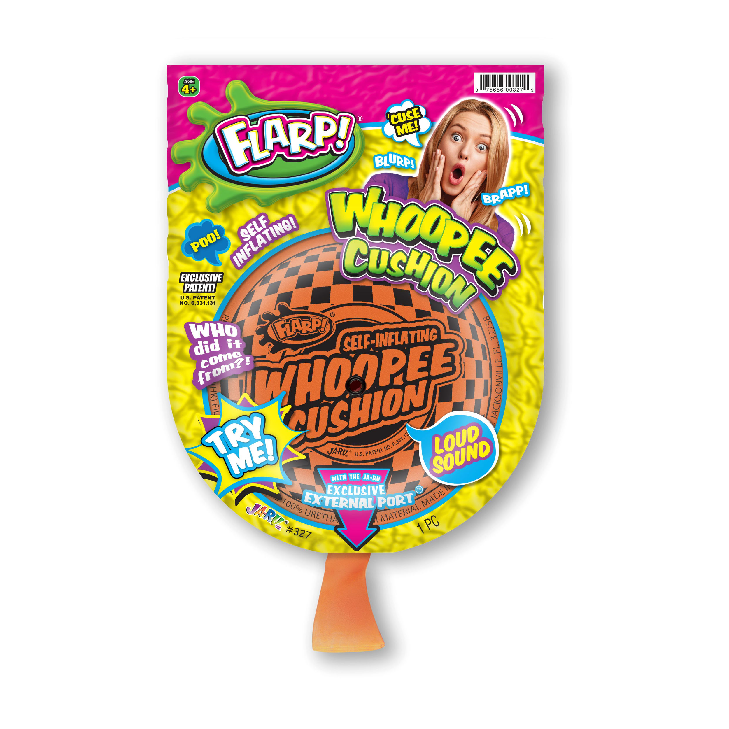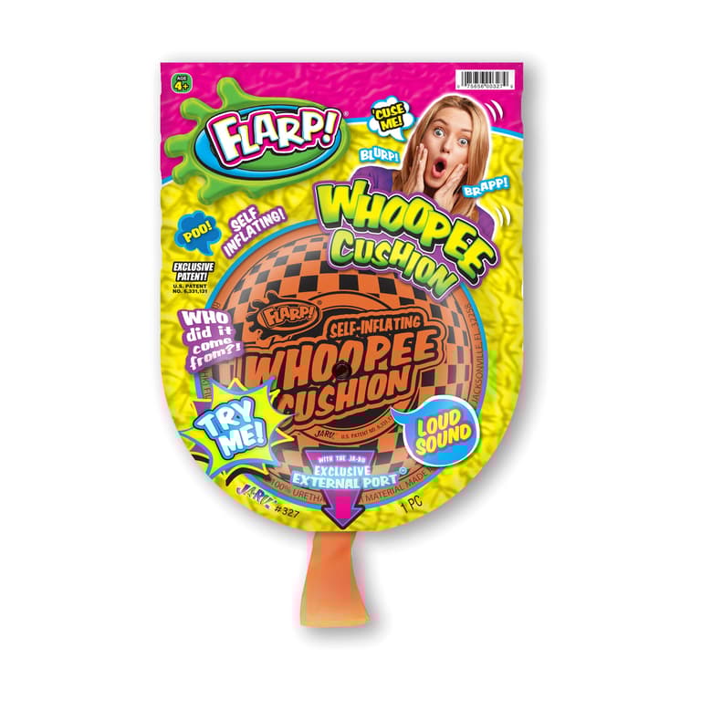 Ages 4+.; Exclusive patented design produces a BIG sound!; Self inflating whoopee cushion; Works over, and over, and over!