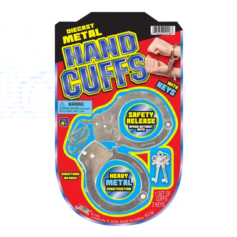 Set of die-cast metal toy hand cuffs with two keys. Ages 6+.Specifications