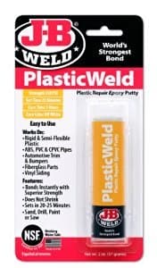 and plumbing; APPLICATIONS ABS PVC & CPVC pipes and plastics; auto bumpers and more; auto bumpers and trim; designed for DIY plastic repairs on ABS PVC & CPVC pipes and plastics; fiberglass parts; J-B WELD PLASTICWELD A hand mixable two part epoxy putty stick that is formulated to repair and rebuild various plastic compounds and surfaces; J-B Weld PlasticWeld has lap shear strength of 600 PSI; marine repairs; plastic water tanks; PlasticWeld can withstand continuous temperatures up to 250oF 121oC and intermittent temperatures up to 300oF 148oC when fully cured; PlasticWeld does not shrink and can be molded shaped sanded drilled and cut; PlasticWeld is certified by the NSF and is safe for contact with potable water; PlasticWeld takes 25 minutes to set and cures in 3 hours; set and cure color is off white; vinyl surfaces and siding
