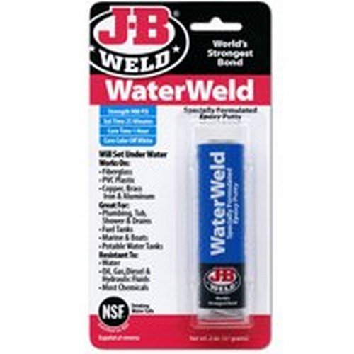 WaterWeld will plug or seal leaks and patch holes and cracks in almost anything. Ideal for repairing plumbing, fuel tanks, tub and shower, drains, pool and spa, boats and potable water tanks; setup occurs even under water. After curing, it can be drilled, tapped, filed, sanded and painted. WaterWeld has a set time of 15-25 minutes and sets hard in one hour. WaterWeld cures to an off-white color, is rated at a tensile strength of 1300 PSI and will withstand temperatures up to 300?F.Specifications