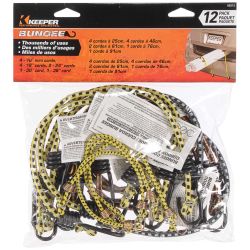 The Keeper Assorted Round Bungee Cords are designed with a durable outer jacket to withstand UV rays and weather damage. Inside premium rubber ensures optimal performance and elasticity for repeated use. This assorted pack features various colors and sizes of vinyl covered steel hooks and mini dichromate steel hooks to keep items securely in place.Specifications