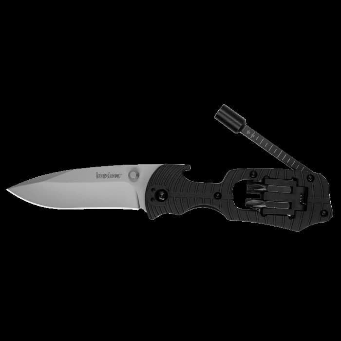 4-piece bit set, ruler, plus full-sized blade; Blade Length 3.4in; Blade Material 8Cr13MoV; choose from two flat head, two Phillips bits; Overall length 7.6in; Reversible pocketclip for left-handed or right-handed carry; Sturdy glass-filled nylon handle with swing out bit carrier; Weight 5 oz