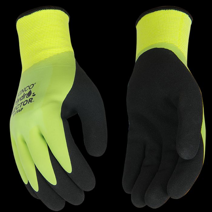 In hazardous work environments you need gloves that will keep your hands comfortable while also keeping you visible. That’s where these hi-visibility HydroFlector gloves come in. Their double-layered knit shell fuses a hi-vis green polyester outer shell with a brushed acrylic inner thermal lining for maximum warmth and visibility in low light. Infused with a water-resistant additive, they repel water like a champ, and their double-coated latex palm gives you a grip that won’t failwhether you’re laying pipe, working on an oil rig, or sorting through recyclables. When your work is done, simply throw them in the washer for easy cleaning.Specifications
