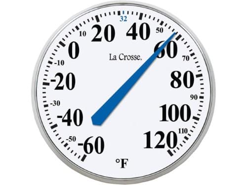 Have more accurate knowledge of the weather with this La Crosse Technology 13.5in Round Thermometer. It gives you more than just a way to monitor the temperature. This indoor outdoor thermometer also bears a secret compartment in which you may hide spare keys. It is easy to hang on a screw or nail and has a weatherproof design. It measures from -60 to 120 degrees F.Specifications