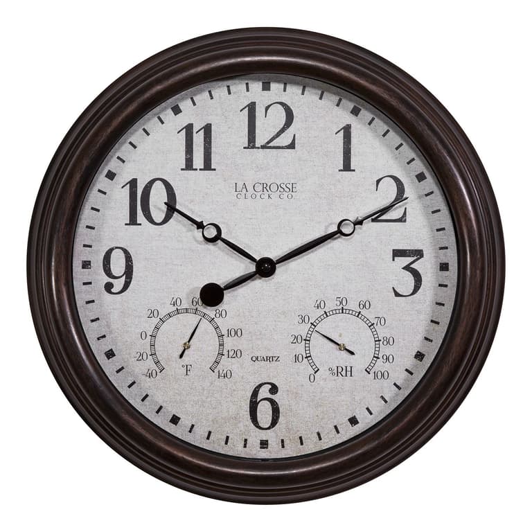 2in deep brown finished frame with classical dial, this clock will add to your home's decor. Battery operated with manual set time, this wall clock can be used indoors or outdoors. A weather sealed casing is resistant to the outdoor elements. Displays your temperature and humidity, behind a glass lens.Specifications