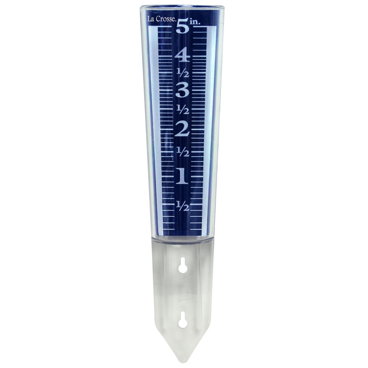12in plastic rain gauge measures up to 5in of rainfall and is perfect for your backyard or garden. Use the attached mounting bracket to mount the rain gauge using a screw (Not Included), or use as a garden or yard stake. Know how the April showers brought your May flowers, with La Crosses Large Plastic rain gauge with Magnifying Easy-to-Read design. This gauge measures your backyard rainfall with large digits and clear measurement lines to ensure accurate readings, even from a distance. The 12 inch Rain Gauge can be mounted onto a fence or deck railing at the ideal height for reading or into the ground using its pointed tip bracket. Mounting hardware is sold separately. The clear, weather resistant acrylic rain-collection funnel can be easily removed making it simple to empty or clean.Specifications