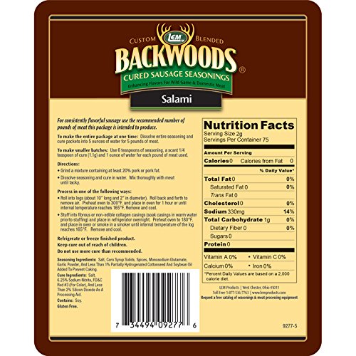 Salami: Excellent lunchmeat. Backwoods Sausage Seasonings have been delighting customers since 1991. We make it simple with our easy to follow instructions and pre-measured cure in every package. Enjoy these Cured Sausage Seasonings painstakingly flavored to make the greatest wild game or domestic meat cured sausage around! Each seasoning package includes a packet of Cure. Casings sold separately.Specifications
