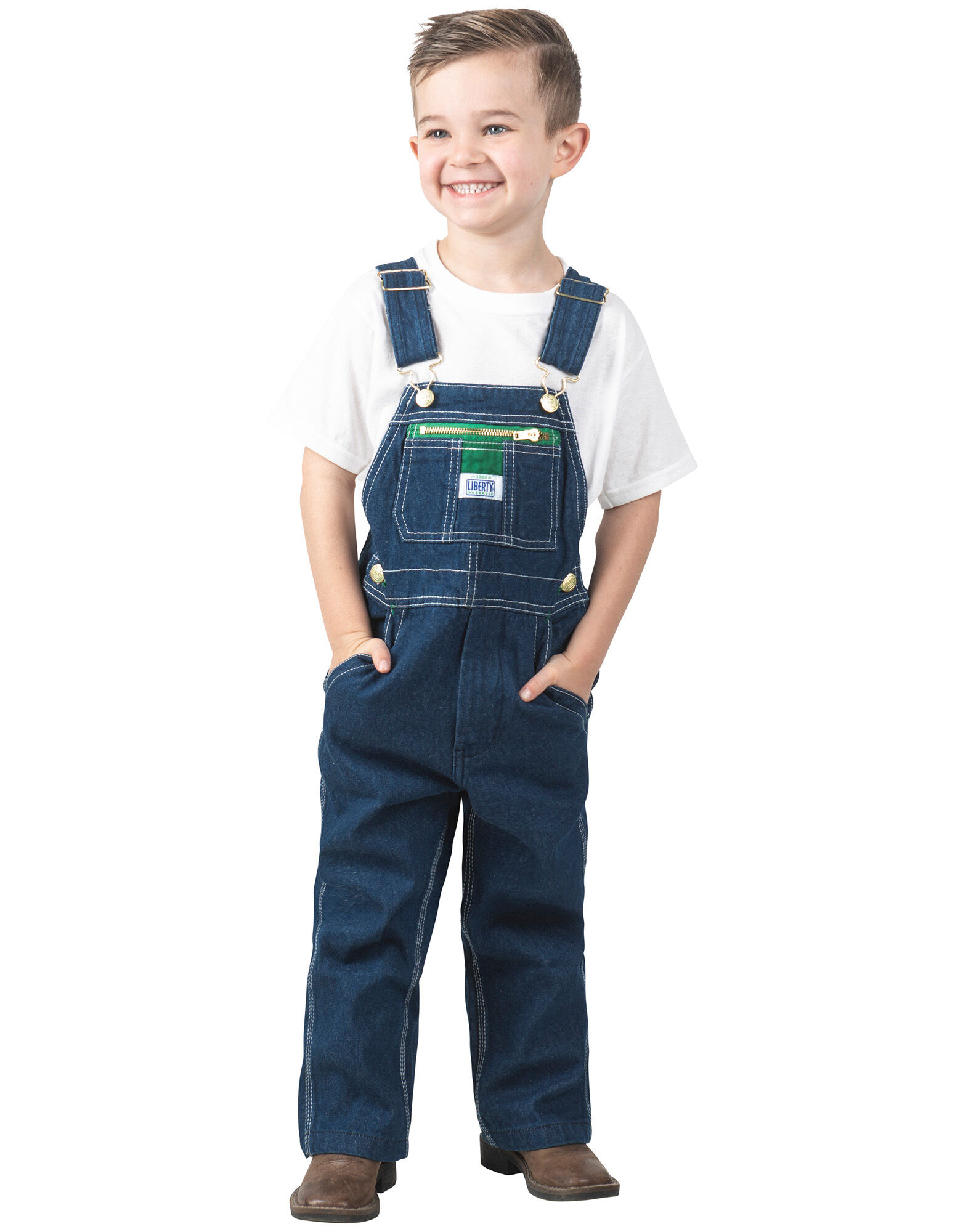 Instill the Liberty tradition in the next generation with our preschool denim bib overalls styled after the iconic pattern in production since 1912. Rinsed for softness and comfort, these denim overalls are durable, adjustable and feature functional pockets for snacks, trinkets and more. Signature Liberty Green accents highlight the bib pocket with durable zippered pouch. Other features include our classic triple-needle stitching throughout to reduce blowouts and provide longer durability, adjustable bib straps to grow into, and functional front and back pockets. Durable 11.5oz. 100% cotton denim material.Specifications