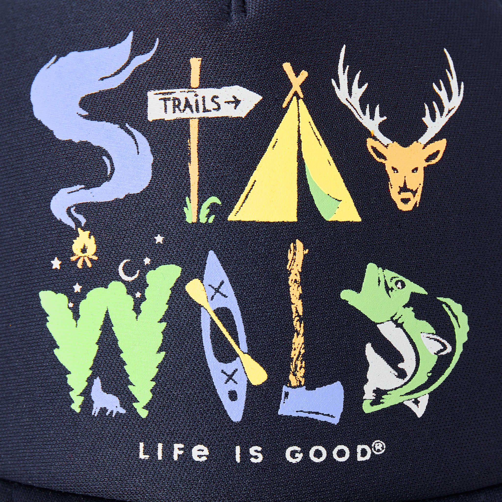 FIRM MESH BACK; FIVE PANEL STRUCTURED LOW-MID CROWN WITH SIX ROWS OF STITCHING ON THE BRIM AND SUBLIMATED PRINT; FOAM FRONT; SNAPBACK WITH LIFE IS GOOD LABEL ON BACK