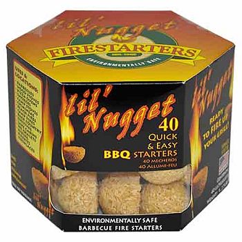CONTAINS 40 CT FIRESTARTER NUGGETS; ENVIORNMENTALLY SAFE; NON-TOXIC FIRESTARTER MADE FROM PINE WOOD