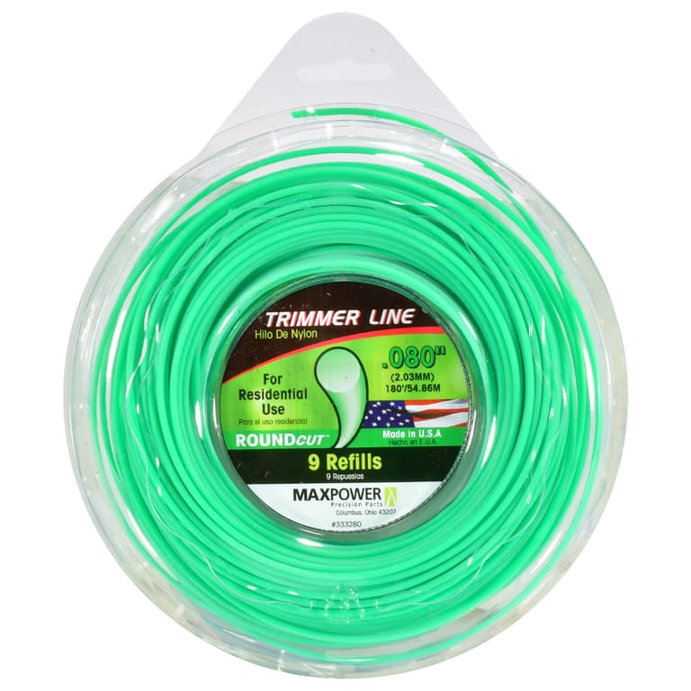 Approximately 9 refills; Green in color; Made from sturdy nylon and provides consumers with a quality cutting line; Residential RoundCut Trimmer Line