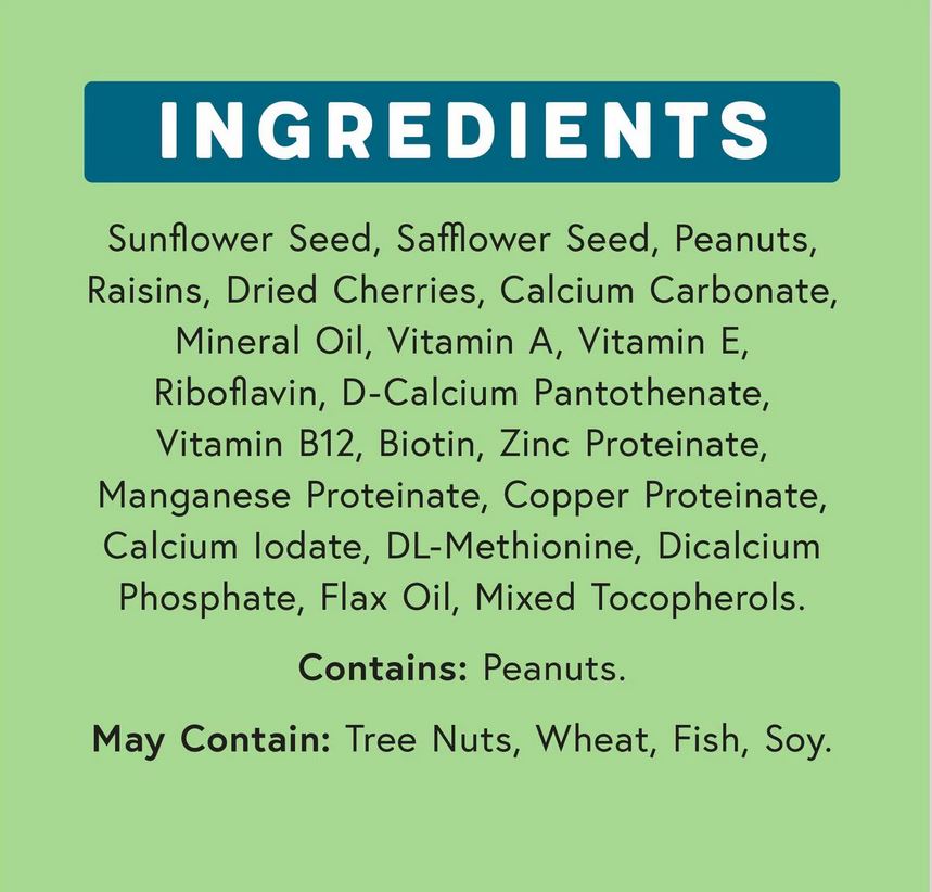 Melody Select Songbird Supreme wild bird food is a blend of choice seeds, nuts, and fruit to attract songbirds all year long. Featuring a rich array of nutritious ingredients including sunflower seeds and chips, safflower seeds, peanuts, raisins, and cherries, this premium blend offers birds an excellent source of healthy fat, protein, and carbohydrates.Specifications