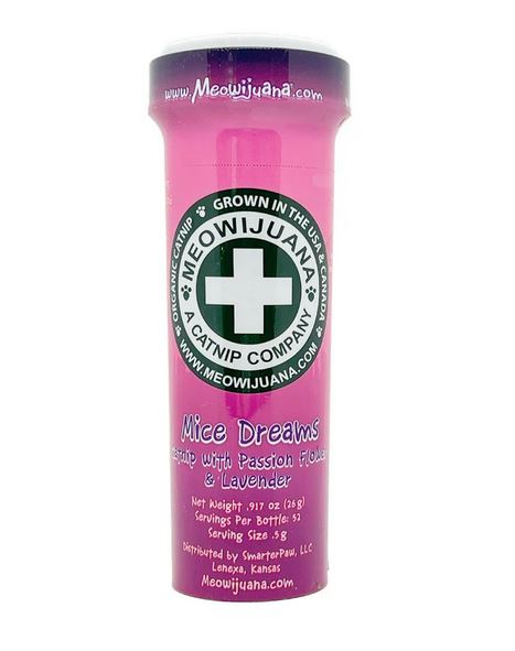Give your favorite feline something to purr about with Meowijuana Mice Dream Catnip, Passion Flower & Lavender Blend. These convenient, eco-friendly containers are full of passion flower and lavender mixed with premium catnip, which was trimmed and picked by hand at the peak of essential oil production. No wonder it's the most radical catnip blend on the market! Plus, the thin bottle makes for painless storage, and the lid keeps your cat’s paws out of the catnip jar without purr-mission. You can bring a jar home to treat your own cats, or give one as a giftthis gnarly nip is formulated for cats at every age, size or breed. Grown here in the United States, Meowijuana is safe, organic, and the perfect size to sprinkle on toys, cat trees, carpet, or wherever you please.Specifications