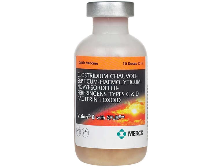 Merck Vision 8 is for use in healthy cattle and sheep as an aid in preventing disease caused by Clostridium chauvoei (Blackleg), Cl. septicum (Malignant edema), Cl. haemolyticum (Bacilliary Hemoglobinuria (Red water)), Cl. novyi (Black disease), Cl. sordellii and Cl. perfringens Types C and D (Enterotoxemia).Specifications