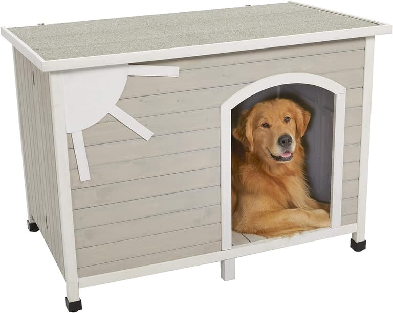 You and your furry friend will have it made in the shade with our Eilio folding dog house by MidWest Homes for Pets. This patent-pending design is the only wood dog house on the market boasting a no tools assembly; simply position the dog house to the desired outdoor location, unfold, and your work is done In addition to the no tools assembly, each outdoor dog house features an elevated floor. This along with a large entry provides additional air flow under the dog house & great air circulation throughout. The dog house also has 4 adjustable legs to create a comfortable & level platform for your dog while being used on uneven surfaces. We are proud of the Eilio dog house and want to ensure you this is a quality product. Each dog house is manufactured from with water resistant stained wood, equipped with stainless steel hardware and has an asphalt shingled roof. MidWest Homes for Pets stands behind the quality of our Eilio Dog house with a 1-Year Manufacturer..Specifications