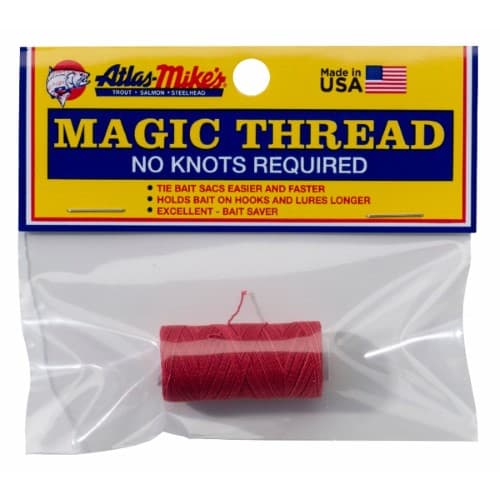Atlas Mike’s Magic Thread, 1 Spool/bag, Red. It's called 'Magic' because that’s what it is! Magic Thread makes tying bait sacs easier and faster. Just three turns around the stem of the sac, pull tightly; then three more turns and pull tightly again. That’s all! No knotting required! Simple and effective. Also makes an excellent bait saver. Wrap around bait on hook or lures to hold bait on longer. Works with shrimp, herring, sardine, salmon roe, crayfish, prawn, etc. Every angler needs to have this product in their tackle box!Specifications