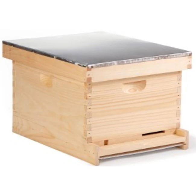 10-frame standard Langstroth Hive, made of unfinished pine; Black foundation installed for easier view of hive activity; Metal frame rest for easier removal of frames; Precision-milled interlocking box joints for maximum strength; Screened bottom board with grip to measure mite presence.; Telescoping outer cover with weather-resistant aluminum top; Vented inner cover to reduce condensation