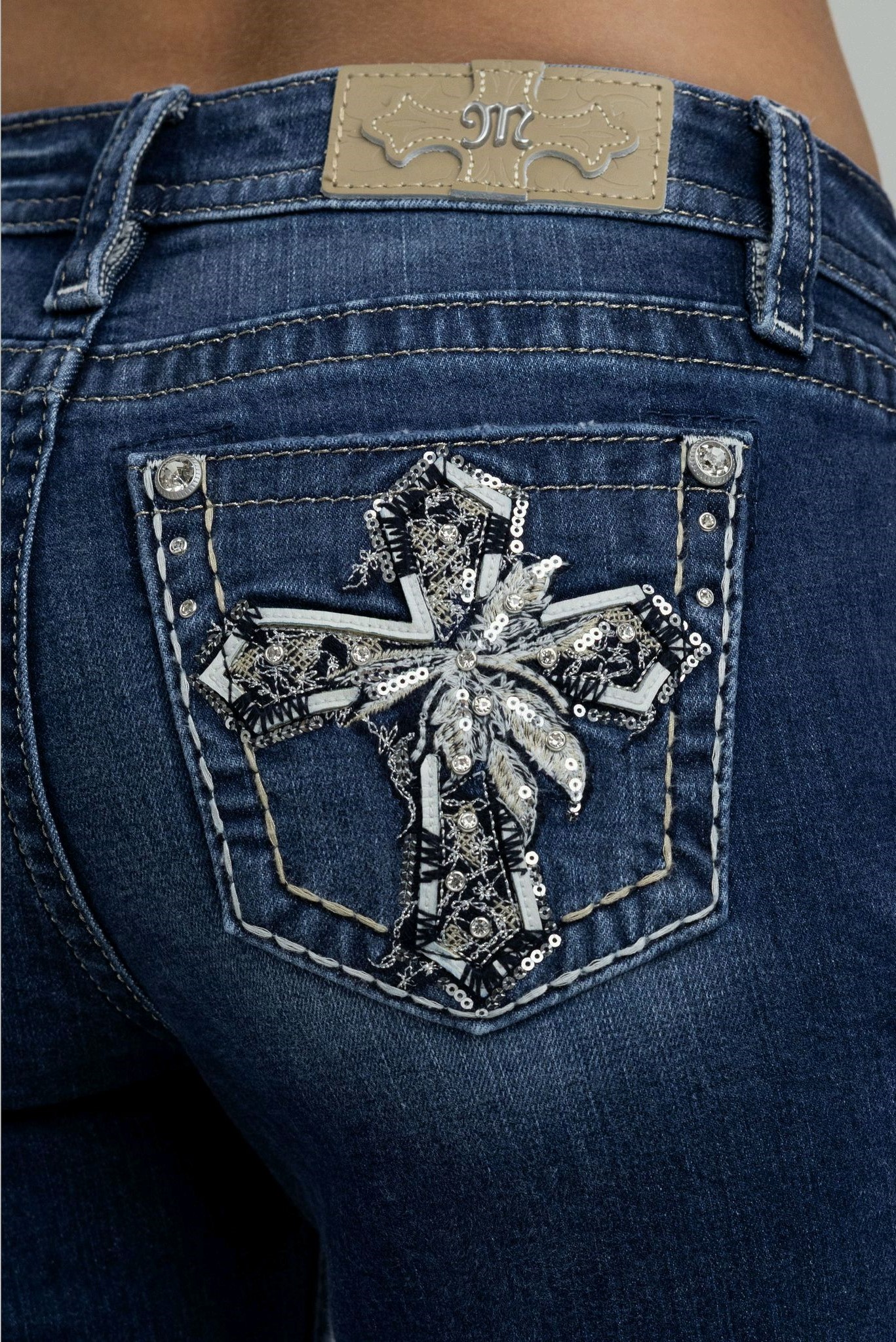 32 INCH INSEAM; BOOTVUT; LOGO PATCH ON HIP; SEQUINED CROSS DETAILING ON BACK POCKETS