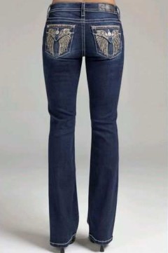 32 INCH INSEAM; BUTTON FLAP BACK POCKET; EMBROIDERED AND BEDAZZLED POCKET; MID-RISE BOOT CUT JEANS