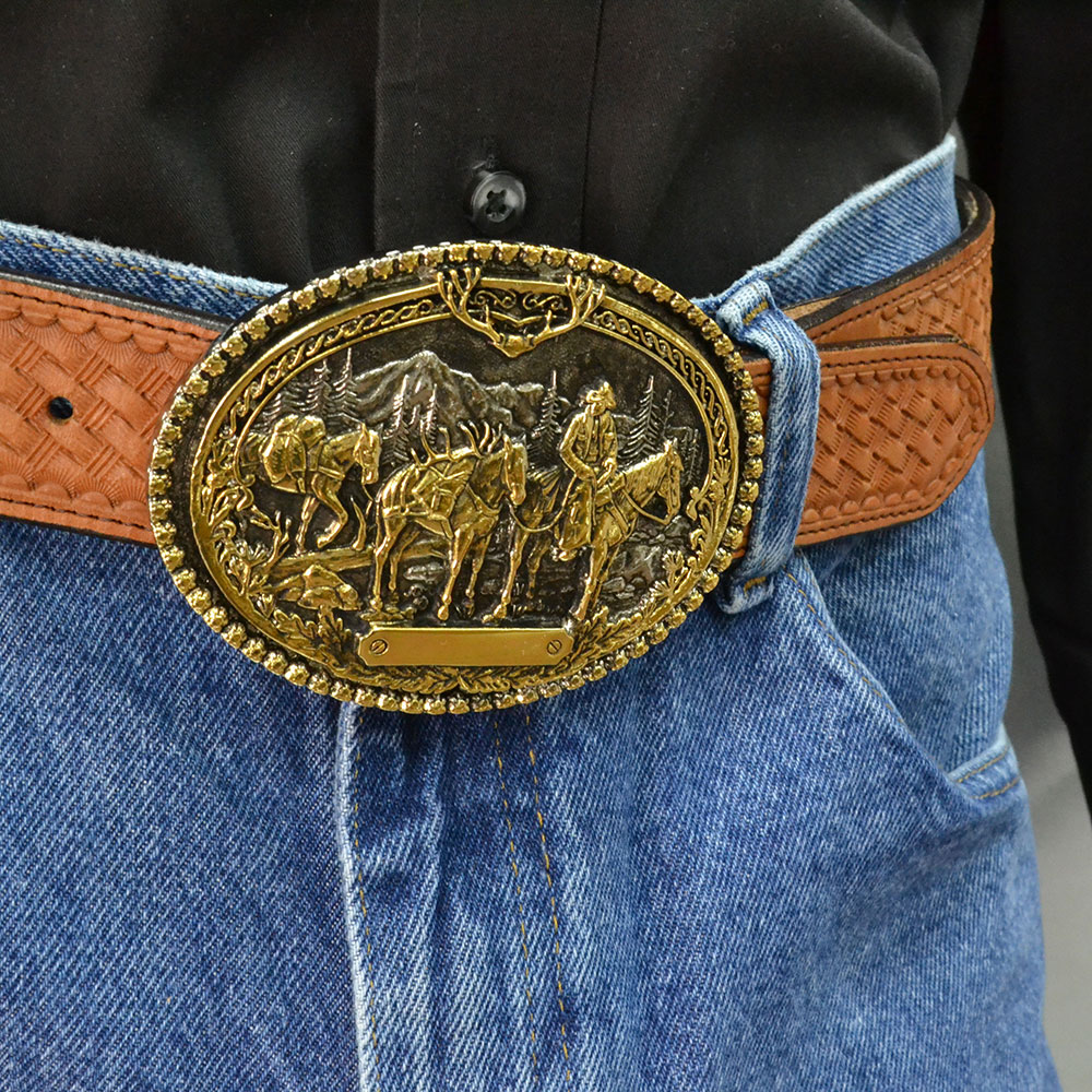 BRASS AND NICKEL PLATE OVER A SOLID CAST METAL ALLOY BASE; FEATURES GOLD COLORED PACK HORSE SCENE; STANDARD 1.5" BELT SWIVEL