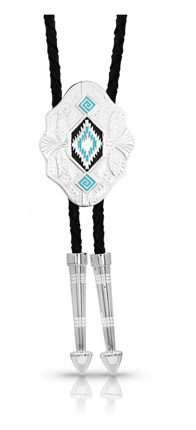 MAKE A STATEMENT WITH THIS SOUTHWESTERN INSPIRED BOLO TIE. THE BRIGHT SILVER TONE OF THE INTERESTING SCALLOPED SHAPED BOLO TIE CREATES THIS BOLD DESIGN. THE STUNNING DESIGN OF THE BOLO TIE IS COMPLIMENTED BY HAND PAINTED DEEP BLACK AND BRIGHT TURQUOISE PAINT ADDING COLOR AND EXCITEMENT TO THE PIECE. PERFECT FOR BOTH CASUAL AND FORMAL WEAR, THE SOUTHWEST SKIES SCALLOPED BOLO TIE IS A MUST HAVE FOR YOUR COLLECTION. THE BLACK BRAIDED LEATHER CORD IS NICELY WEIGHTED WITH TWO SILVER TONED ARROW POINTED TIPS.Specifications