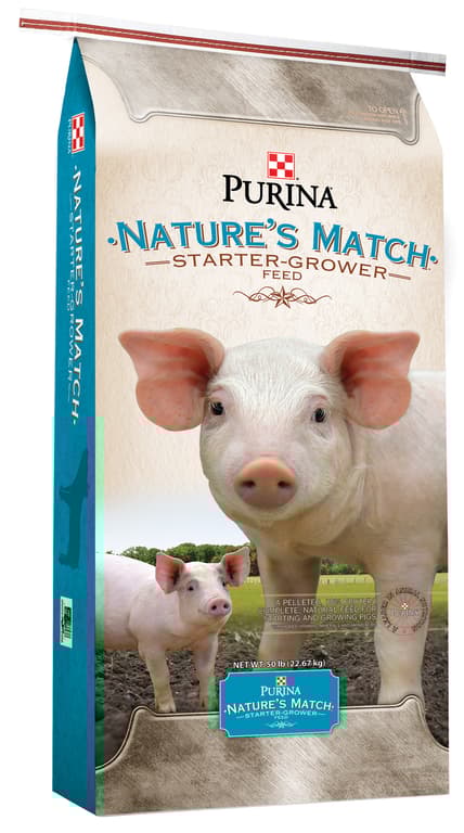 Nature’s MatchStarter-Grower is a complete, all-natural feed made to provide optimal nutrition for pigs weighing from 25 pounds to 100 pounds. This 18% protein product is formulated to help pigs transition to grower-finisher diets with less complex ingredients. Nature’s MatchStarter-Grower is pelleted to maximize performance and minimize feed waste.Specifications