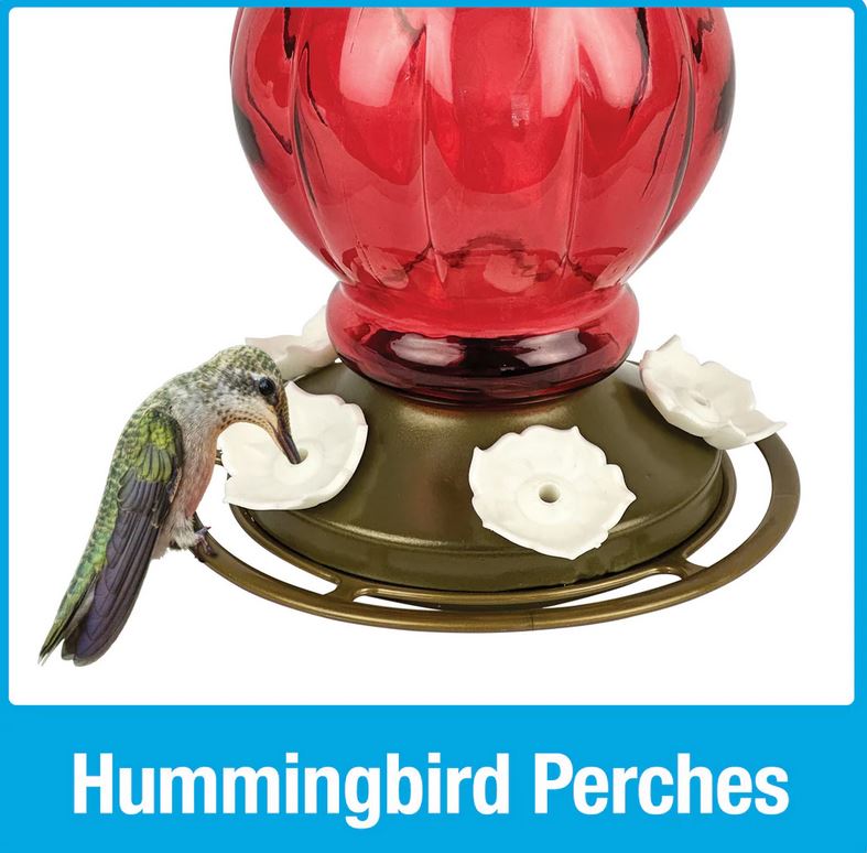 Experience the joy of feeding the hummingbirds in your backyard with this Antique Hummingbird Gravity Feeder! This feeder's unique antique feel, hummingbird-friendly features, and easy maintenance design are sure to make it your new favorite hummingbird feeder. Maximize hummingbird comfort and viewing with five flexible lifelike flower ports and a built-in continuous perch ring for more perching space. Defend your nectar and protect your hummingbirds with the domed feeder base and flower ports which create a naturally bee-resistant design. Never worry about trapped dirt or grime since the two-part base system and removable flower ports allow the feeder to be completely disassembled for a thorough cleaning. The large red glass reservoir holds up to 25 oz of nectar.Specifications