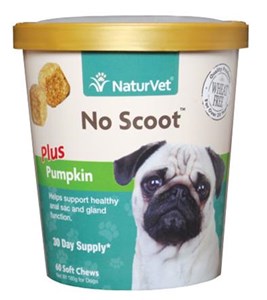 NaturVet No Scoot soft chews help support healthy anal gland function in dogs over 12 weeks of age. A special proprietary blend of natural active ingredientssuch as Beet Pulp, Flaxseed, and Psyllium Huskhelps with normal bowel function, and added pumpkin boosts soluble fiber. These tasty treats could be just what you need to help your pup get back to normal!Specifications