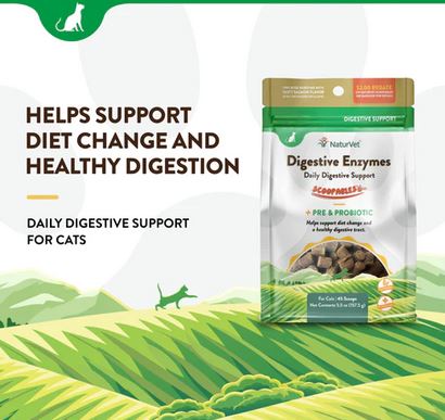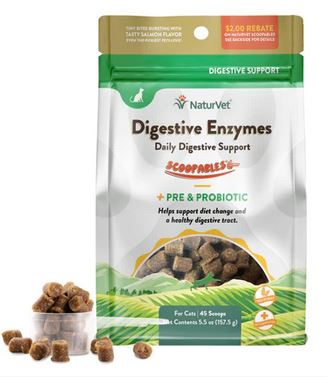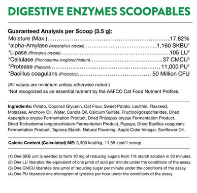 Scoopables Digestive Enzymes Daily Digestive Support is flavor packed and bursting with tasty salmon flavor, perfect for finicky eaters and just as efficacious as our original soft chews. Veterinarian formulated for cats over the age of 6 weeks. Prebiotic, probiotic, and digestive enzymes nourish the natural gut bacteria and assist in the digestion and absorption of essential nutrients. Bacillus coagulans probiotic provides a source of live (viable) naturally occurring microorganisms. Perfect for sensitive stomachs, food transitioning, and daily support.Specifications