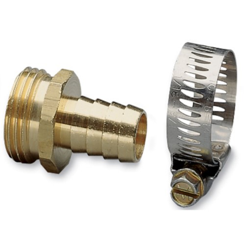 Hose repair; Machined Brass swivel coupling and shank; Male connection includes washer; Repairs 5/8" garden hoses; Stainless Steel worm gear hose clamp