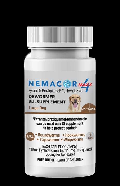 Nemacor Maxx 4 Quad Wormer is a GI supplement for use against Hookworms, Roundworms, Whipworms and Tapeworms. Suggested dosage is one tablet based on the dogs weight. Two tablets per bottle in all sizes.Specifications